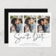 BUDGET Modern Handgeschriebene Save the Date Multiple Foto Card in Schwarz/Weiß in einem eleganten Schriftart, der ein romantisches handgeschriebenes Gefühl hervorruft. Entwickelt um drei Ihrer bevorzugten Foto für zusätzliche Anpassungen zu verwenden. Fügen Sie einfach Ihre Namen und Daten für ein wirklich personalisiertes Design hinzu. **Unser BUDGET-Papier ist kleiner und zarter, aber trotzdem schön!** Wenn Sie Hilfe oder passende Artikel benötigen, kontaktieren Sie uns bitte unter cedarandstring@gmail.com.
