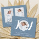 Stellen Sie Ihren schönen Neugeborenen mit dieser günstigen Geburtsankündigung vor. Auf der Vorderseite steht das Wort Freude in der stylischen White Script Typografie auf blauem Hintergrund und das Foto Ihres Neugeborenen, den vollständigen Namen, das Ankunftsdatum und die Geburtsdaten. Auf der Kartenrückseite können Sie zwei zusätzliche Fotos hinzufügen.