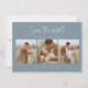 Budget Blue Simple Calligraphy Script Vier Foto Save the Date verfügt über ein Trio von Fotos auf der Vorderseite, zusammen mit modernen, minimalen Typ. Ein Single großes Foto auf der Rückseite, mit Ihrer Hochzeitswebsite.