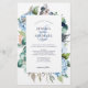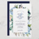 Budget Hochzeitseinladung. Rustikales Hochzeitsdesign mit Blumenstrauß aus blauen Hydrangea, blauen und weißen Anemonenanemonen-Blume, Eukalyptus-Blätter, Dahlien und Grünpflanzen. Navy Papier, weiße Schrift. Ideal für rustikale Hochzeit, Sommerhochzeit.