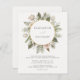 Diese elegante Hochzeitseinladung zeigt einen goldenen Kreis, umgeben von einer blumengeschmückten Aquarellbilderei mit Elfenbein-Rose und Grün auf weißem Hintergrund. Passen Sie den grauen Holzkohle-Text mit Ihren Hochzeitsdetails an. Die Rückseite ist ein koordinierender Schatten von weißlicher Farbe.