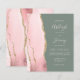 Die links Kulisse dieser modernen Hochzeitseinladung besticht durch eine rosa Wasserfarbe, die durch einen vergoldeten Imitat-Glitzer bestickt wird. Der individuell anpassbare Text kombiniert hellblaue Handschrift, Copperplate und kursiv Schriftart auf tiefgrünem Hintergrund. Auf der Rückseite ist ein passendes Rose- und Gold-Agate-Design zu sehen.