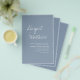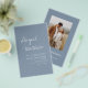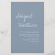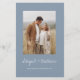 Budget Personalisieren Sie diese Boho Simple Elegant Dusty Blue und White Stilvolle Einladung mit Ihrer Nachricht und Details mit einem eleganten Foto auf der Rückseite. Diese minimalistische Einladung beinhaltet stilvolle handgeschriebene Schriftzeichen mit moderner Farbe für die besondere Hochzeitstagsfeier.