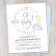 Niedliche und skurrile, preisgünstige Babydusche mit boho-inspiriert pastellblauen und gelben Aquarellen aus Regenbogen, Sonne, Herz, Sternen, Monden und Wolken und "Oh Baby!" in einer stilvollen Kalligraphieschrift.