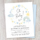 Niedliche preisgünstige Shimsical Baby Boy Sprinkle Einladung mit boho-inspiriert pastellblauen und gelben Wasserfarben eines Regenbogens, Sonne, Herz, Sterne, Monde und Wolken und "Oh Baby!" in einem stilvollen Kalligrafieschrift.