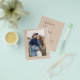 Budget Hochzeit Boho Terracotta Speichern Sie die Date Cards, die ein Foto auf der Vorderseite haben. Die Save the Date-Karten enthalten eine moderne, handgeschriebene, kursive Schriftzeichen-Typografie, die elegant, einfach und modern nach einem einfachen Hochzeitstag-Fest zu verwenden sind.