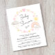 Eine preisgünstige, knebelige Babydusche mit rosa und gelben Wasserfarben eines Regenbogens, Sonne, Herz, Sterne, Monde und Wolken.