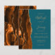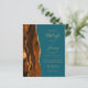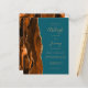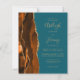 Die links Seite dieses eleganten, modernen Hochzeitseinladens besticht durch eine gelbe, orangefarbene Wasserfarbe, die mit vergoldetem Imitat-Glitzer bestickt wurde. Der anpassbare Text kombiniert goldfarbene Handschrift, Copperplate und kursiv Schriftart auf einem aquamarinen blauen Hintergrund. Die Rückseite weist ein passendes Drehdesign auf.