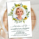 Moderne Sonnenblume & Eukalyptus Gedenkfeier / Feier des Lebens Einladung. Diese Beerdigung-Einladungen zum Beileid verfügen über ein Foto in einer Sonnenblume und Eukalyptuskranz-Design. Personalisieren Sie diese Feier der Beerdigung des Lebens mit Ihren Lieben Fotos, Name & Daten, Veranstaltungsdetails. COPYRIGHT © 2021 Judy Burrows, Black Dog Art - Alle Rechte vorbehalten. Eukalyptus-Sonnenblume Foto Feier zur Einladung zum Leben