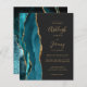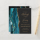 Der links Rand dieser eleganten, modernen Hochzeitseinladung zeichnet sich durch eine aquamarine Aquarellgrenze aus, die mit Imitaten mit goldenem Glitzer bestickt wurde. Der anpassbare Text kombiniert goldfarbene Handschrift, Copperplate und kursiv Schriftart auf dunkelkohlegrauem Hintergrund. Auf der Rückseite ist ein aquamarines und goldenes Design zu sehen.