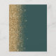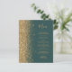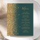 Die links Seite dieses eleganten, modernen Hochzeitsmenüs besticht durch einen vergoldeten Glitzer mit Imitaten. Der anpassbare Text verbindet goldfarbene, whimsikale Handschrift-Skripte mit Copperplate-Schriftart auf einem dunkelgrünen Hintergrund. Auf der Rückseite ist ein passendes dunkelgrünes und goldenes Glitzer-Design zu sehen.