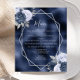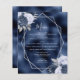 Dieses moderne Hochzeitsmenü besticht durch einen silbernen geometrischen Rahmen, der mit staubblauen, marineblau und silberblauen Blumenbouquets auf einer Folie mit marineblauen blauen Imitaten dekoriert ist. Der anpassbare Text kombiniert silbergraue, weißliche Handschrift, Kupferplatte und kursiven Schriftart.