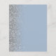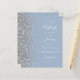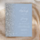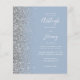 Die links Kulisse dieser eleganten, modernen Hochzeitseinladung besticht durch eine silberne Imitat-Glitzer-Grenze. Der anpassbare Text kombiniert weiße Handschrift, Copperplate und kursiv Schriftart auf einem staubblauen Hintergrund. Auf der Rückseite ist ein passendes silberfarbenes und staubblaues Design erkennbar.