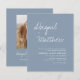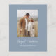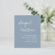 Budget Personalisieren Sie diese Boho Simple Elegant Dusty Blue und White Stilvolle Einladung mit Ihrer Nachricht und Details mit einem eleganten Foto auf der Rückseite. Diese minimalistische Einladung beinhaltet stilvolle handgeschriebene Schriftzeichen mit moderner Farbe für die besondere Hochzeitstagsfeier.