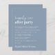 Einfache, preisgünstige, staubblaue Hochzeitsankündigung und Einladung zum Empfang. Die Vorderseite zeigt "Happily Ever After Party" in einer Mischung aus zeitgenössischem Weiß-Drehbuch und fett moderner weißer Typografie. Personalisieren Sie Ihre Nachricht und Einladung und fügen Sie Ihre Namen in ein signaturähnliches Skript ein. Dieses halbglänzende Haushaltspapier ist gewichtsähnlich wie Foto. Es ist auch eine größere 12x18-Kartenversion verfügbar (für den Link die Meldung).