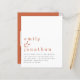 Einfache Text QR Code Terracotta Hochzeit. Ein Preis SMALLER 4,5" x 5,6" Alternative. Erhältlich in einem SEMI-GLOSS 110 lb CARD STOCK, der die Standardoption (dicker für Einladungen) ist, ODER einem SATIN FINISH 80 lb THINNER PAPER STOCK (ideal für Gehäuse). Fügen Sie Ihren QR-Code zu Ihrer Hochzeitswebsite auf der Rückseite macht dies zu einer bequemen Option für Ihre Gäste, um alle Details zu sehen, ohne dass separate UAWG- und Detailkarten erforderlich sind. Einfach und. Informell sind Ihre Vornamen in Terrakotta mit den Details unten groß in stilvollen Kleinbuchstaben. Personalisieren Sie den Text einfach. Auf der Rückseite ist eine koordinierende Terrakotta.