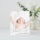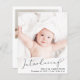 Eine preisgünstige Option, um die Geburt Ihres Babys anzukündigen, mit seinem oder ihrem Foto mit "Vorstellung" in einem stilvollen Drehbuch mit Herzschlag. Fügen Sie unten seinen Namen, das Geburtsdatum und die Geburtsdaten hinzu. Fügen Sie auf der Rückseite ein weiteres Foto und eine personalisierte Meldung hinzu.