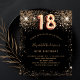 Eine moderne, stilvolle und glamouröse Einladung für die 18. Geburtstagsfeier eines Mädchens. Ein schwarzer Hintergrund mit Glitzer aus Imitaten. Der Name ist mit einem modernen goldfarbenen handgeschriebenen Stilskript geschrieben. Personalisieren Sie Ihre Party-Daten und fügen Sie sie hinzu. Nummer 18 wird mit einem Schriftart im Ballonstil geschrieben, Skript.