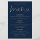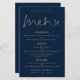 Budget Elegantes Script Gold Navy Blue Wedding Menü. Ein preiswertes 5,5" x 8,5", Ein elegantes typografisches Design in Gold und Weiß, mit einem stilvollen Set-Skript für das Header-Menü. Personalisieren Sie einfach die Erholung des Textes auf Ihre eigenen Details, die Alternativen für Ihre veganen oder vegetarischen Optionen beinhaltet. Sie können auch Textstile und -farben sowie die Hintergrundfarben ändern, indem Sie die Option Weitere Einstellungen vornehmen.