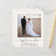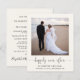 Einfache leichte Creme preisgünstige Unterkunft oder kleinere Hochzeitsankündigung und Post-Hochzeitsempfang oder Party Einladung. Die Vorderseite zeigt Ihr Foto, "glücklich immer nach" geschrieben in einem trendigen Skript mit Swashes und Ihre Vornamen und Hochzeitstag und Ort. Auf der Rückseite können Sie Ihre Hochzeitsankündigung detaillierter personalisieren, einen Empfang oder eine Party Einladung hinzufügen und Ihre verheirateten Namen in einem signaturähnlichen Skript unterschreiben.