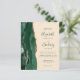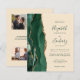 The left-hand edge of this elegant modern wedding invitation features an emerald green watercolor agate border trimmed with faux gold glitter. The customizable text combines green handwriting, copperplate and italic fonts on a champagne beige background. The reverse side provides spaces for 4 photos (1 square, 2 horizontal, 1 long vertical) and room for your wedding website URL or other information.