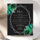 Dieses elegante, moderne Hochzeitsmenü besticht durch einen silbernen geometrischen Rahmen, der mit smaragdgrünen und silberfarbenen Blumenbouquets auf schwarzem Hintergrund dekoriert ist. Der anpassbare Text kombiniert silbergraue, weißliche Handschrift, Kupferplatte und kursiven Schriftart. Die Rückseite ist schwarz.