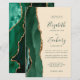 The left-hand edge of this elegant modern wedding invitation features an emerald green watercolor agate border trimmed with faux gold glitter. The customizable text combines green handwriting, copperplate and italic fonts on a champagne beige background. The reverse side features a matching emerald green and gold agate design.
