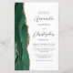 The left-hand edge of this elegant modern wedding invitation features an emerald green watercolor agate border trimmed with faux gold glitter. The customizable text combines charcoal gray script and sans serif fonts on a white background. A matching emerald green agate design appears on the back of the card.