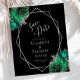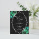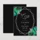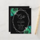 Diese elegante moderne Hochzeit bewahrt die Dattelkarte mit einem silbernen geometrischen Rahmen, der mit smaragdgrünen und silberfarbenen Blumenbouquets auf schwarzem Hintergrund dekoriert ist. Der anpassbare Text kombiniert silbergraue, weißliche Handschrift, Kupferplatte und kursiven Schriftart. Die Rückseite ist schwarz.