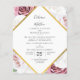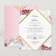 Elegantes blumengeschmücktes Hochzeitstil mit einer rosa Rosa-Blume mit einem geometrischen Rahmen mit Goldeffekt. Aus der Kollektion "Moderne Flora und Geometrie" zeigt dieses wunderschöne und raffinierte Layout Ihre Hochzeitsdetails in einem stilvollen Drehbuch und moderner Typografie mit einem reichen Bouquet auf weißem Hintergrund. Dieses Budget für Hochzeitseinladung ist nicht mit einem Umschlag, aber ein A6-Umschlag wäre dafür perfekt geeignet. Auch auf dieser Website verfügbar