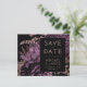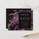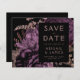 Diese elegante, launische Hochzeit Save the Date-Karte bietet ein üppiges, romantisches Blumenstrauß lila mit Rose Gold Imitate Folie und Glitzer Blattwerk auf einem schwarzen Hintergrund. Passen Sie den Rose-farbigen Text in stilvollen Schriftart auf einem schwarzen Rechteck an. Fügen Sie zusätzliche Details auf der Rückseite, und geben Sie Ihre Hochzeitswebsite URL, um einen QR-Code zu generieren.