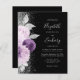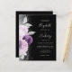 Die links Seite dieses eleganten, modernen Hochzeitseinladens besticht durch einen Blumenstrauß in lila und Lavendeltönen, bestickt mit Silberfolie aus Imitat und Imitat Glitzer und mit silberfarbenem Imitat-Glitzer. Der anpassbare Text kombiniert beige silbergraue Handschrift, Copperplate und kursiv Schriftart auf schwarzem Hintergrund. Fügen Sie zusätzliche Details auf der Rückseite, zusammen mit einem QR-Code, um Ihren Gästen zu helfen, besuchen Sie Ihre Hochzeitswebsite.