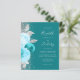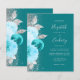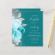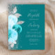 Die links Seite dieses eleganten, modernen Hochzeitseinladens besticht durch einen Blumenstrauß in türkisfarbenen und hellblauen Farbtönen, besticht durch silberne Imitate und Imitate Glitzer und besticht durch einen Glitzer aus silbernen Imitaten. Der individuell anpassbare Text kombiniert handgeschriebene, hellsilbergraue Schrift, Copperplate und kursiv Schriftart auf türkisfarbenem Hintergrund. Auf der Rückseite ist ein passendes türkisfarbenes und silberfarbenes Blumendesign.
