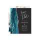 Der links Rand dieser eleganten modernen Hochzeit speichern Sie die Dattelkarte mit einem aquamarinen blauen Aquarellrand bestickt mit Imitaten silbernen Glitzer. Der anpassbare Text kombiniert silbergraue Handschrift, Kupferplatte und kursiv Schriftart auf einem schwarzen Hintergrund. Ersetzen Sie das Beispielbild auf der Rückseite einfach durch Ihr eigenes vertikales Foto.