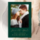 Diese schlichte, minimalistische Save the Date-Karte weist ein vertikales Foto über den Worten "Save the Date" in elegantem goldfarbenem Handschriftzeichen auf, gefolgt von den Namen der Ehepaare, dem Hochzeitstag und der Stadt in serifenlosen Schriftart auf einem smaragdgrünen Hintergrund. Fügen Sie eine detailliertere Nachricht mit weiteren Informationen auf der Rückseite hinzu.