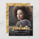 Moderne Abschluss-Ankündigung mit einem individuellen vertikalen Foto. Das Wort "Graduate" erscheint in goldenen Imitat-Folienskripten mit lockig dekorativen Swashes am Anfang und Ende. Fügen Sie den Namen, die Schule und das Jahr des Abschlusses unten in weißen Sans Serif Schriftart. Ersetzen Sie das Beispielbild einfach durch das Foto Ihres eigenen Absolventen. Ein Schwarzer Farbverlaufsbildschirm trägt dazu bei, die Pop des Textes zu gewährleisten. Auf der Rückseite befindet sich ein goldenes Imitat-Foliendiagramm. Ideal für High School oder Uni-Abschluss.