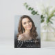 Eine budgetfreundliche Option, um die Leistungen Ihres Absolventen anzukündigen. Diese stilvolle Abschluss-Ankündigung zeigt ihr Lieblings-Foto mit "Graduate", auf dem oben in einem eleganten weißen Drehbuch geschrieben steht. Darunter können Sie ihren Namen, Schule und Jahrgang hinzufügen. Fügen Sie auf der Rückseite ein zusätzliches Foto und eine personalisierte Nachricht hinzu.