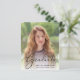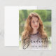 Eine Budgetoption, um die Leistungen Ihres Absolventen anzukündigen. Diese elegante Abschluss-Ankündigung zeigt sein Lieblings-Foto mit "Graduate", das in einem stilvollen Drehbuch auf der Spitze steht. Geben Sie den Namen, die Schule und das Unterrichtsjahr ein.