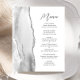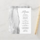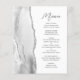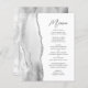 Die links Seite dieses eleganten, modernen Hochzeitsmenüs besticht durch ein graues Aquarelldesign, das mit Imitaten aus silberem Glitzer besticht. Der benutzerdefinierbare Text kombiniert handgeschriebene handgeschriebene Schriftzeichen aus Holzkohle und serifenlose Schriftart auf weißem Hintergrund. Das grau-silber-grau-agate Design wird auf der Rückseite wiederholt.