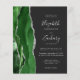 The left-hand edge of this elegant modern wedding invitation features a hunter green watercolor agate border trimmed with faux silver glitter. The customizable text combines silver gray handwriting, copperplate and italic fonts on a dark off-black background. The reverse side provides spaces for 4 photos (1 square, 2 horizontal, 1 long vertical) and room for your wedding website URL or other information.