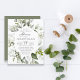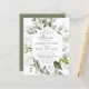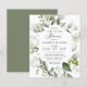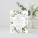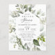 This Budget Greenery Floral Bridal Shower Invitation - features black handwritten script with lush floral frame consisting of white flowers and white berries and with greenery twigs on the white background. The reverse side of the bridal invitation is dusty green.