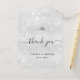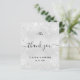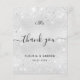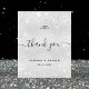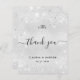 Eine Hochzeit Dankeschön Karte. Ein Imitat silber metallisch aussehende Hintergrundfarbe. Mit Imitaten Glitzer Staub. Auf der Vorderseite, ein großes handgeschriebenes Skript und der Text: Danke, Ihre Monogramm Initialen, Namen und ein Datum. Zurück: Personalisieren und hinzufügen Sie Ihren Dank Notizen und Namen.