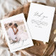 Budget Hochzeit Dankeschön Karten, die ein Foto auf der Vorder- und Rückseite haben. Die Dankeschön-Karten enthalten eine moderne, handgeschriebene, kursive Schriftzeichen-Typografie, die elegant, einfach und modern nach Ihrer Hochzeitsfeier zu benutzen sind.