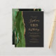 This elegant modern birthday party invitation features a hunter green watercolor agate border trimmed with gold faux glitter. The customizable text combines gold-colored script and sans serif fonts on a slate black background. The reverse side features a matching green and gold agate design.