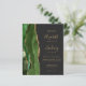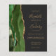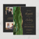The left-hand edge of this elegant modern wedding invitation features a hunter green watercolor agate border trimmed with faux gold glitter. The customizable text combines gold-colored handwriting, copperplate and italic fonts on a dark off-black background. The reverse side provides spaces for 4 photos (1 square, 2 horizontal, 1 long vertical) and room for your wedding website URL or other information.