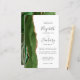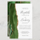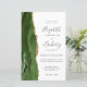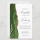 The left-hand edge of this elegant modern wedding invitation features a hunter green watercolor agate border trimmed with faux gold glitter. The customizable text combines charcoal gray handwriting, copperplate and italic fonts on a white background. The reverse side features a matching hunter green and gold agate design.
