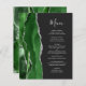 Le bord gauche de cet élégant menu mariage moderne comporte une bordure en aquarelle vert chasseur ornée d'une parties scintillant en faux argent. Le texte personnalisable combine écriture manuscrite et polices de caractères en gris argenté sur un arrière - plan non noir. L'envers présente un design d'agate vert et argenté assorti.