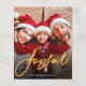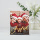 Eine preisgünstige und moderne Ferienkarte, die auf einem flachen Blatt gedruckt ist und ein einfaches, auf Foto basierendes Design mit "Joyful" in einem eleganten, handgeschriebenen, goldfarbenen Drehbuch verwendet. Ändern Sie einfach das Foto auf der Vorderseite und schalten Sie den Familiennamen oder Firmennamen mithilfe der vorgegebenen Vorlagenoptionen aus. Bitte kontaktieren Sie den Designer, wenn Sie Fragen oder Probleme zu diesem Design oder zu passenden Produkten haben.