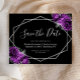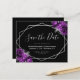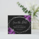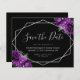 Diese elegante Hochzeitskarte rette-the-date mit einem silbernen geometrischen Rahmen, der mit lila und silbernen Blume auf schwarzem Hintergrund dekoriert ist. Der anpassbare Text kombiniert silbergraue, weißliche Handschrift, Kupferplatte und kursiven Schriftart.