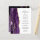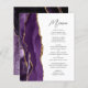 Die links Seite dieses eleganten, modernen Hochzeitsmenüs besticht durch ein lila Aquarelldesign mit vergoldetem Imitat-Glitzer. Der benutzerdefinierbare Text kombiniert handgeschriebene handgeschriebene Schriftzeichen aus Holzkohle und serifenlose Schriftart auf weißem Hintergrund. Das lila und goldene Agerat-Design wird auf der Rückseite wiederholt.